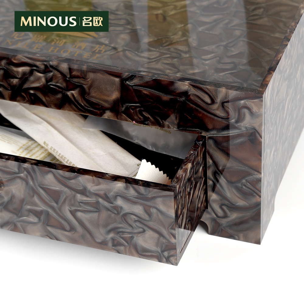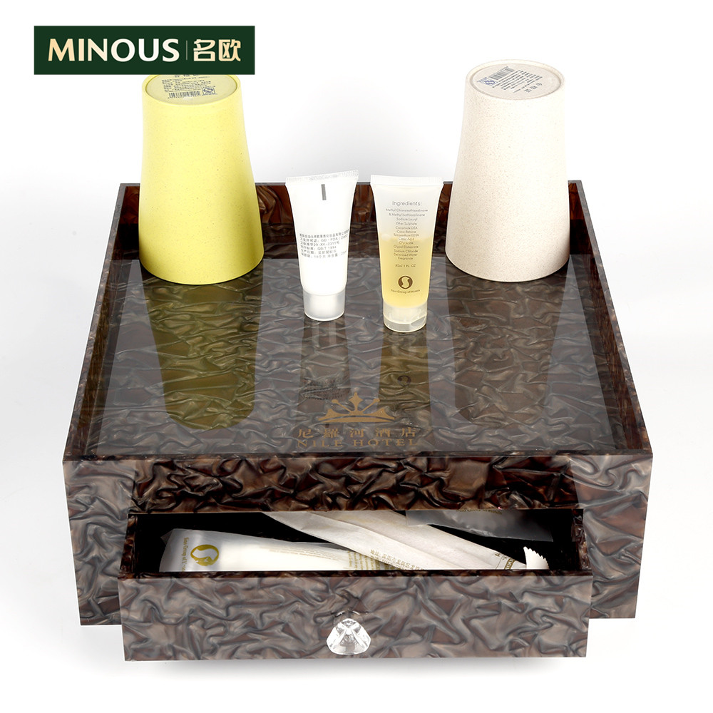 亚克力洗漱消耗用品收纳盒经常使用在酒店客房,这款收纳盒会让客人感觉到快捷、方便,上面可放置杯子、沐浴液、洗发水、香皂等,下面抽屉可以放置一次性牙膏、牙刷、梳子等等。