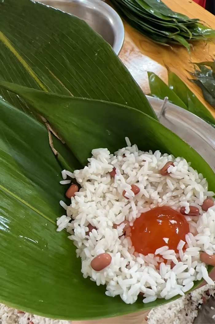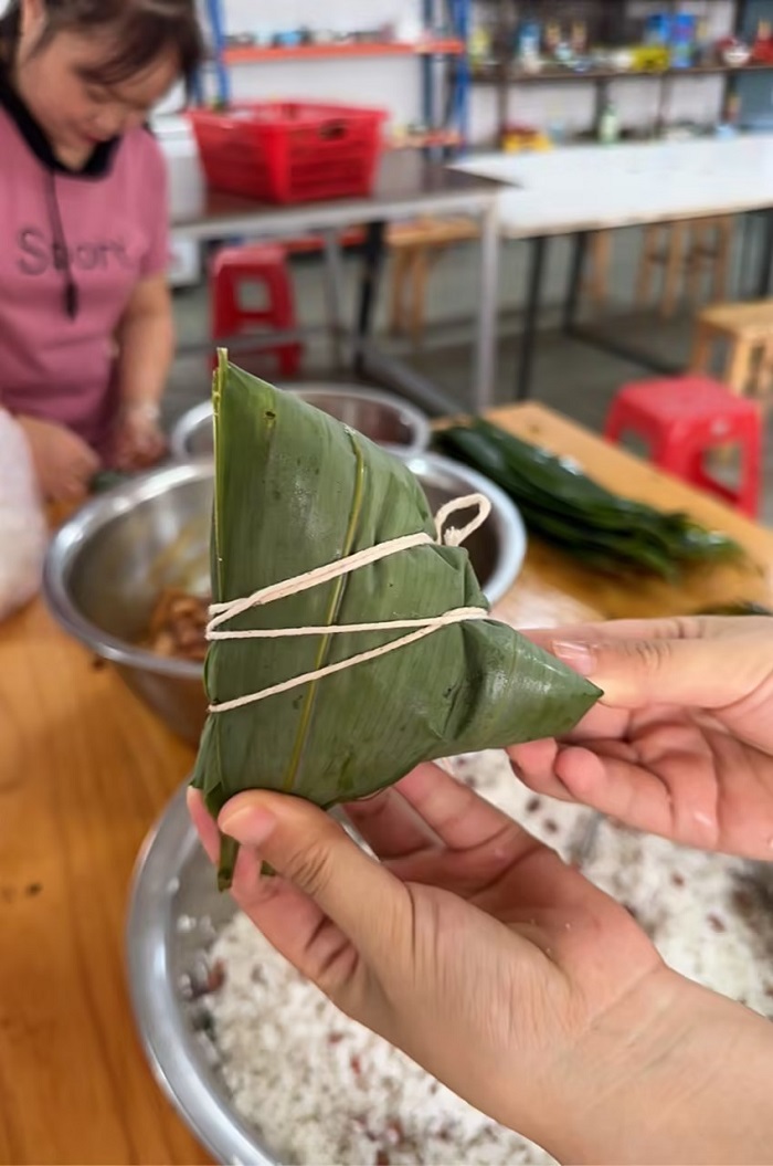 糯米和肉的香气弥漫在空气中。大家积极投入,新手们虚心学习,老手们热情传授,一双双忙碌的手让一个个可爱的粽子成型。